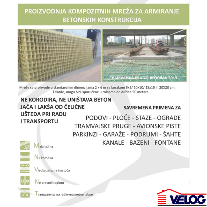 Prednosti | • Otpornost na vlagu i hemikalije – bez korozije tokom eksploatacije; • Niska toplotna provodljivost – sprečava pojavu "hladnih mostova"; • Manja težina u odnosu na čelik do 5 puta (lakši transport i ugradnja); • Visoka zatezna čvrstoća (veća od čelika po jedinici mase); • Lako se seče i ugrađuje bez posebnog alata; • Ekološki prihvatljiv proizvod, bez uticaja na armirani beton; • Dugotrajna zaštita bez dodatnih premaza; • Pogodna za temelje, podne ploče, staze, ograde, vinogradarske i poljoprivredne objekte. |
