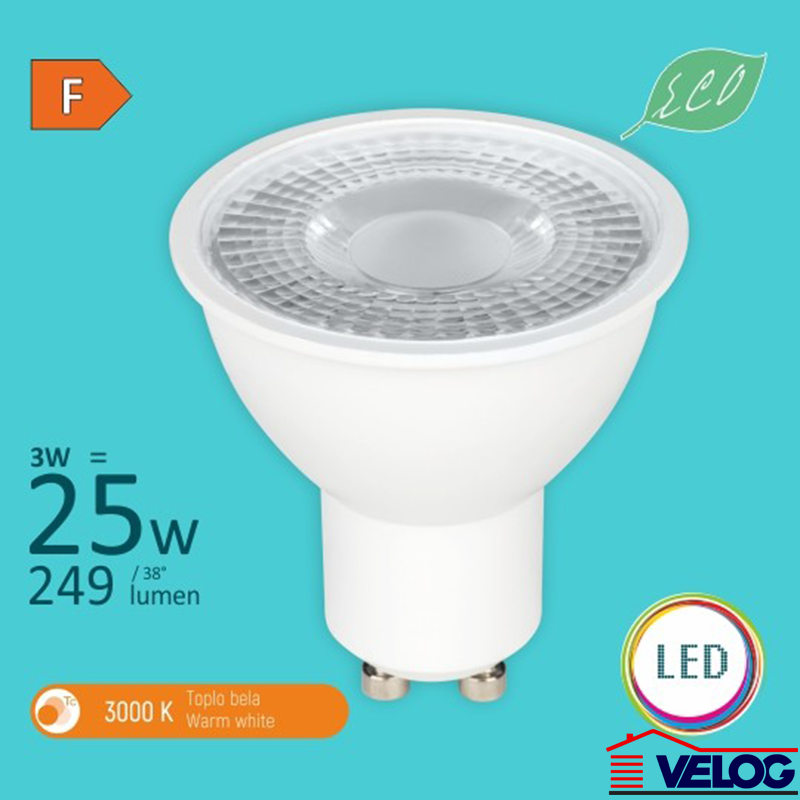 Karakteristike | • LED:SMD • Tip grla:GU10 • Dimenzija sijalice:Ø50 x H55mm • Oblik:MR16 • Radni napon:220~240V • Radna frekvencija:50/60 Hz • Nominalna struja proizvoda:30mA • Power factor:>0,5 • Snaga (procenjena):3W • Potrošnja elek. energije:3 Kwh/ 1000h • Energetska efikasnost 2019.:F • Ekvivalent (LED-Inkandes.):3W⇔25W • Lumen / Watt:80-90 • Lumen flux (nom.):249 (lm) • Temp. boje svetl.:3000 K (Toplo bela) • Vreme trajanja zagrev. do .:< 1s • Vreme startovanja:≤ 0,5 s • Ugao rasipanja svetlosti (.:38º • CRI - indeks reprodukcije.:≥80(Ra) • Faktor odražavanja svetlo.:≥0,8% / 6000h • Faktor LLMF na kraju nom. .:70% • Faktor preživljav. sij. (.:≥0,9/6000h • Indeks konzistentnosti boj.:≤ 6 sdcm • IP zaštita:IP20 • Materijal:Termoplastika • Stepen električne zaštit.:II klasa • Životni vek:20.000 h na 25° C • Sadržaj žive (Hg):Hg=0.0 mg • Temperatura okoline:-20~ +40 °C • Dimabilnost:Ne • ON-OFF ciklus prekida:10.000 X • Ispravno odlag. nakon upot.:WEEE • Napomena:Usmerena sijalica • Upotreba u domaćinstvu:Da • Upotreba u potpuno zatvore.:Ne • Upotreba u vlažnim prosto.:Ne • Dizajn vrha sijalice:Mat |