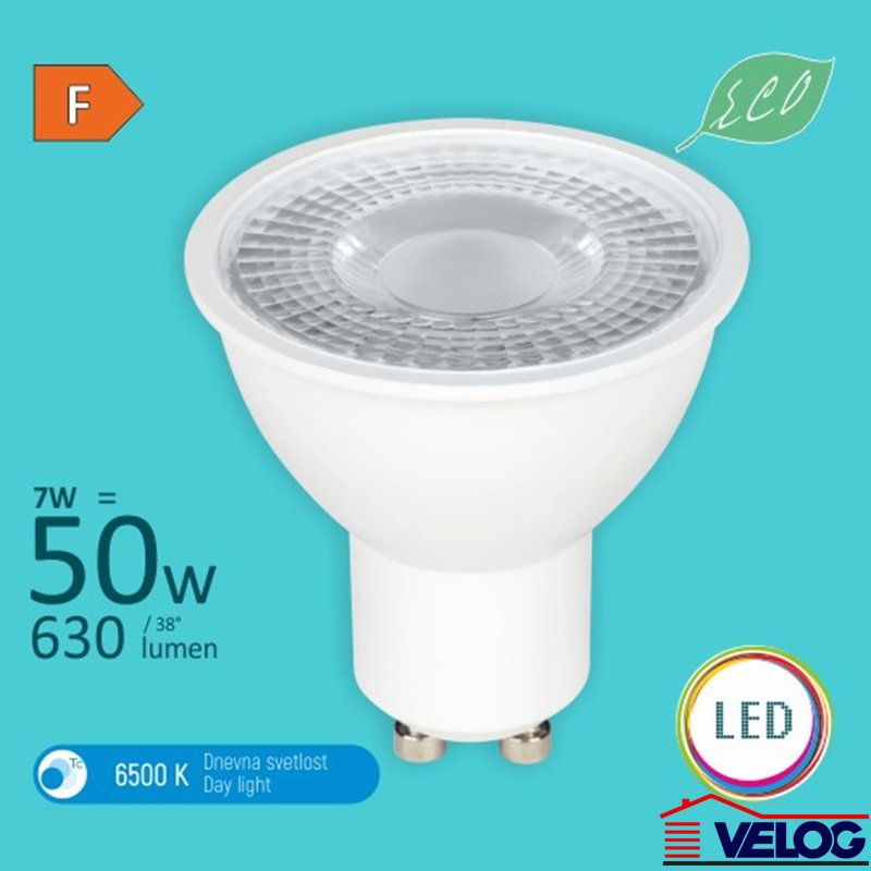 Karakteristike | • LED:SMD • Tip grla:GU10 • Dimenzija sijalice:Ø50 x H55mm • Oblik:MR16 • Radni napon:220~240V • Radna frekvencija:50/60 Hz • Nominalna struja proizvoda:70mA • Power factor:>0,5 • Snaga (procenjena):7W • Potrošnja elek. energije:7 Kwh / 1000h • Energetska efikasnost 2019.:F • Ekvivalent (LED-Inkandes.):7W⇔50W • Lumen / Watt:80-90 • Lumen flux (nom.):630 (lm) • Temp. boje svetl.:6500 K (Dnevna svetl.) • Vreme trajanja zagrev. do .:< 1s • Vreme startovanja:≤ 0,5 s • Ugao rasipanja svetlosti (.:38º • CRI - indeks reprodukcije.:≥80(Ra) • Faktor odražavanja svetlo.:≥0,8% / 6000h • Faktor LLMF na kraju nom. .:70% • Faktor preživljav. sij. (.:≥0,9/6000h • Indeks konzistentnosti boj.:≤ 6 sdcm • IP zaštita:IP20 • Materijal:Termoplastika • Stepen električne zaštit.:II klasa • Životni vek:20.000 h na 25° C • Sadržaj žive (Hg):Hg=0.0 mg • Temperatura okoline:-20~ +40 °C • Dimabilnost:Ne • ON-OFF ciklus prekida:10.000 X • Ispravno odlag. nakon upot.:WEEE • Napomena:Usmerena sijalica • Upotreba u domaćinstvu:Da • Upotreba u potpuno zatvore.:Ne • Upotreba u vlažnim prosto.:Ne • Dizajn vrha sijalice:Mat |
