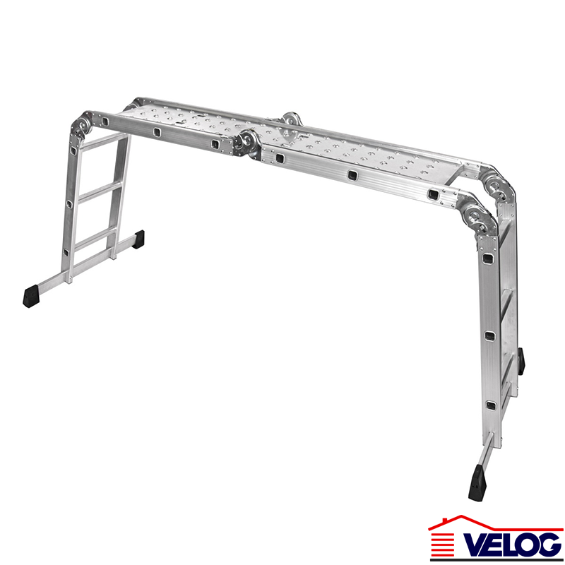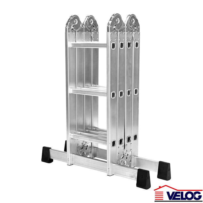 Merdevine aluminijumske sklopive poseduju Atest o bezbednosti, prema standardu EN131. Izrađene su od specijalne lagane legure alumijuma što im omogućava maksimalno opterećenje i do 150kg. Sastavljene su iz 4 dela, što pruža 4 različite opcije postavljanja. Dodatna platforma garantuje stabilnu potporu tokom radnih aktivnosti. Visina merdevina podešenih u poziciju platforma je 0.9m, dužina platforme je 1.62m. Debljina aluminijuma je 1.2mm. Četvorodelne, sa 4 mogućnosti kombinovanja Visina rasklopljenih merdevina: 337cm Izrađene od aluminijuma Maksimalno opterećenje: 150kg Testirano po EN131 standardu
